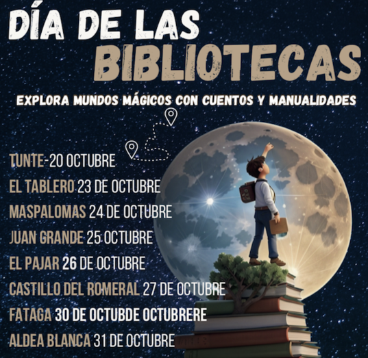 La misma actividad se ha programado en las bibliotecas de los centros culturales de Maspalomas (24 de octubre), Juan Grande (día 25), Fataga (día 26), Castillo del Romeral (27), El Pajar (día 30) y Aldea Blanca (día 31).