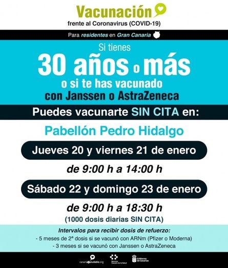 Este nuevo punto de vacunación, coordinado por el Complejo Hospitalario Universitario Insular de Gran Canaria, estará operativo de lunes a viernes de 9.00 a 14.00 horas y los sábados y domingos de 9.00 a 18.30. horas, y hasta él podrán acudir sin cita previa los mayores de 30 años, así como la población infantil de entre 5 y 11 años.