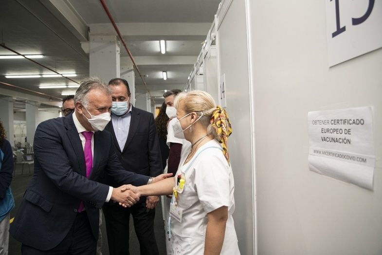 El presidente de Canarias, Ángel Víctor Torres, junto al consejero de Sanidad, Blas Trujillo, y el director del Servicio Canario de Salud, Conrado Domínguez, ha visitado este lunes el punto de vacunación contra la COVID-19 en el Instituto Ferial de Canarias (INFECAR), cuando se cumplen dos años de la detección del primer caso de coronavirus de España, que se produjo en La Gomera. Durante este período Canarias se ha mantenido como la comunidad autónoma con menos contagios de todo el país.