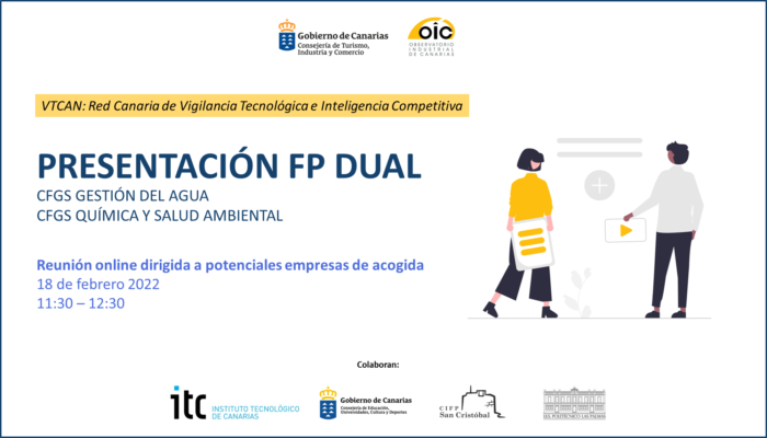 La Consejería de Turismo, Industria y Comercio del Gobierno de Canarias, a través del Instituto Tecnológico de Canarias (ITC), colabora con la Consejería de Educación, Universidades, Cultura y Deportes, en la búsqueda de empresas para acoger alumnado de Formación Profesional Dual (FP Dual), concretamente, de los ciclos formativos superiores de Química y Salud Ambiental y de Técnico Superior de Gestión del Agua.