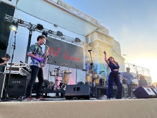 Cuando se puso el sol se encendieron los focos del escenario de la plaza de Los Algodoneros y comenzó el concierto con la canaria Mel Ömana y su banda. Nada mejor para empezar que un menú sano que hacerlo saboreando canciones de papaya: “La envidia es el miedo a lo que admiras, si tienes algo malo que decir cuida como te miras, yo nunca llevo mangas y llevo el as de picas, así suena Canarias, si comes ajos pica”.