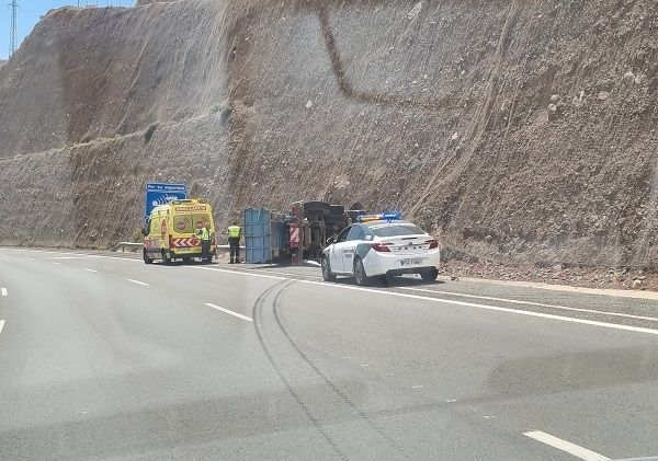 Acciente de tráfico en la GC3 a la salida de Las Palmas de Gran Canaria. Un camión que se desconocen las causas volcó con su carga, justamente al comienzo de la bajada hacia la Laja, dirección sur.