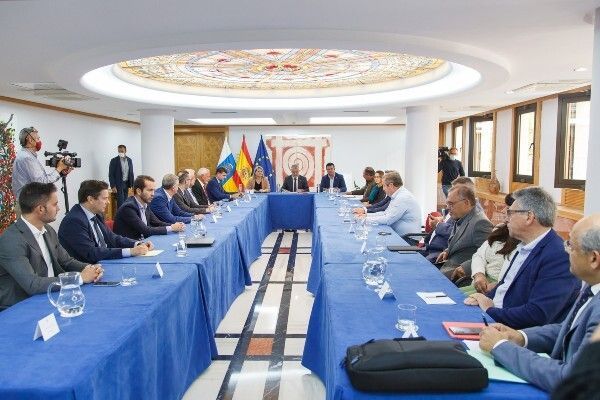 El presidente de Canarias, Ángel Víctor Torres, junto a la consejera de Agricultura, Ganadería y Pesca, Alicia Vanoostende, ha mantenido en la mañana de hoy, lunes 2 de mayo, en Presidencia del Gobierno en Las Palmas de Gran Canaria, una reunión con representantes de organizaciones agrarias, industriales, distribuidores y supermercados para dar respuesta a la situación de incertidumbre por la que pasa el sector como consecuencia del aumento de los precios de la alimentación animal, el encarecimiento de las materias primas y el combustible, entre otros.