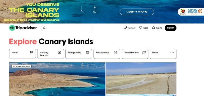 Además, se han elaborado dos ‘landing pages’ en diversos idiomas, ubicadas en la web de los operadores (www.tripadvisor.co.uk/Tourism-g187466-Canary_Islands-Vacations.html y www.expedia.de/spotlight/TurespanaCanaryIslandsde), de manera que todos los impactos sean redirigidos a un espacio específico para el destino, donde se ofrecerá contenido inspiracional y también diversas ofertas para que el turista pueda comprar.