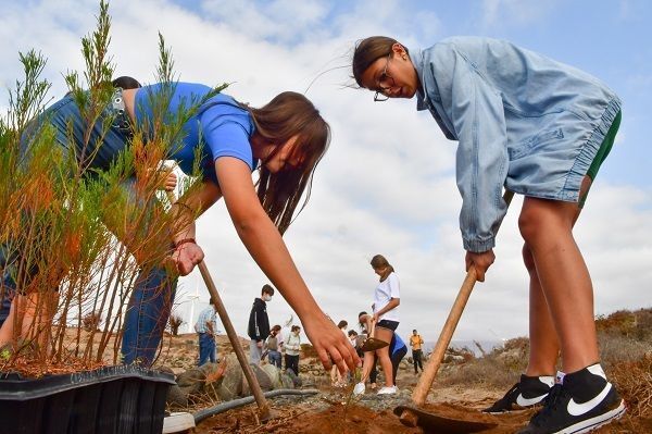 Estudiantes del IES Vecindario y del IES La Minilla participaron este martes en una plantación de 200 tarahales canarios de las Salinas de Tenerife. El centro santaluceño y el IES La Minilla de la capital grancanaria participan desde hace tres años en un proyecto Erasmus + que les ha servido para compartir experiencias pedagógicas y acciones como la plantación en Pozo Izquierdo.