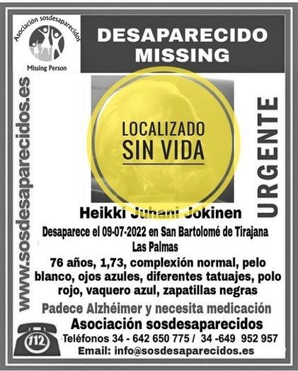 Se le daba por desaparecido desde el sábado 9 de julio de este año. Los datos característicos son su estatura 1,73cm, complexión normal, pelo blanco, ojos azules, y diferentes tatuajes.