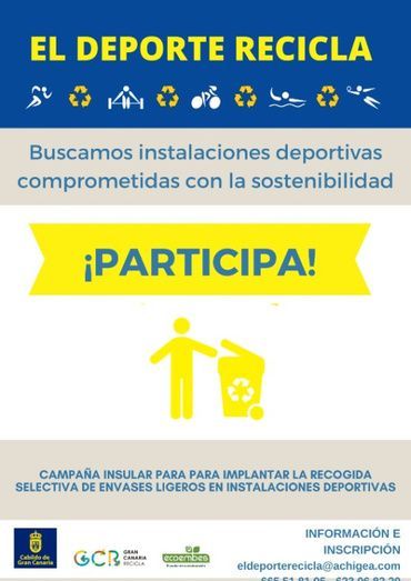 El Servicio de Residuos de la Consejería de Medio Ambiente del Cabildo de Gran Canaria, en colaboración con Ecoembes, ha puesto en marcha la Campaña ‘El Deporte Recicla’, una iniciativa de seis meses de duración cuyo objetivo es facilitar los recursos y apoyos necesarios para que las instalaciones deportivas implanten buenas prácticas ambientales, de cara a reducir la generación de envases ligeros (plásticos, latas y briks) y, en su caso, la separación y recogida selectiva de los mismos.
