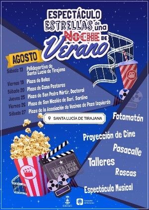 Además de la proyección cinematográfica, cada evento contará con talleres, pasacalles y espectáculos musicales que amenizarán las tardes de verano, a partir de las 18:30, para pasar a la proyección de una película diferente cada día, desde las 21:30. Esta oferta comenzará el próximo sábado 13 con una proyección en el polideportivo de Santa Lucía de Tirajana de la obra cinematográfica para toda la familia “Las Brujas” dirigida por Roald Dahl; a continuación pasará el viernes 19 a la Plaza de Balos con la película “A todo tren destino a Asturias”, una desternillante comedia infantil dirigida por Santiago Segura. Al día siguiente, el sábado 20 en la Plaza de Casa Pastores, se proyectará la cinta de animación “Spirit: indomable”. El jueves 25, en la Plaza de San Pedro Mártir en el Doctoral, las roscas saltarán entre efectos especiales y basquet con una de las películas más taquilleras del año pasado “Space Jam: Una nueva era”. La última semana de verano comienza en el pueblo de Sardina, en la plaza de San Nicolás de Barí, el viernes 26, con la reposición de “A todo tren destino a Asturias”, y al día siguiente, sábado 27, en la Plaza de la Asociación de Vecinos del pueblo marinero de Pozo Izquierdo, “Las Brujas”.