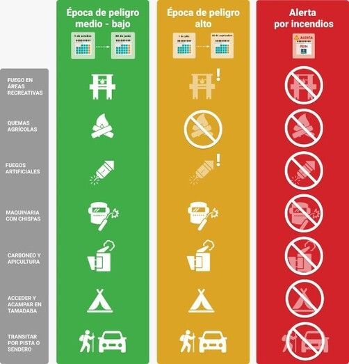Se prohíben, entre otras actividades, usar fuego en albergues, zonas de acampada y áreas recreativas, maquinaria que genere chispas y las quemas agrícolas y forestales