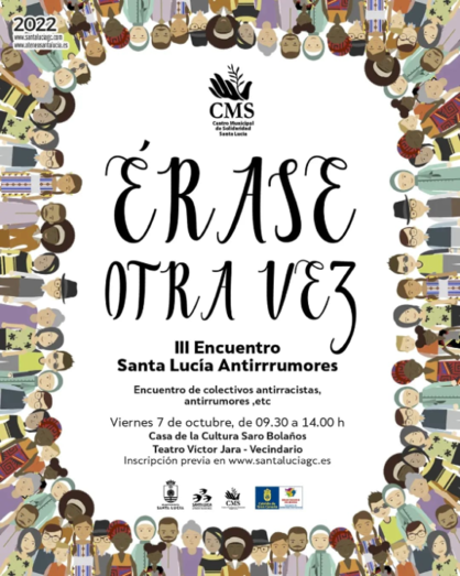 Una exposición de viñetas antirracistas y un  diálogo  con los viñetistas  J. Morgan y Carolina Bonino y una activista social abrirán el próximo 4 de octubre el III Encuentro Santa Lucía Antirrumores. Durante la próxima semana también está programada la formación ‘cómo ser antirracista’, se representará una obra de teatro social a cargo de la compañía Sin papeles y habrá un encuentro de organizaciones sociales que trabajan por la convivencia intercultural y en contra del racismo.