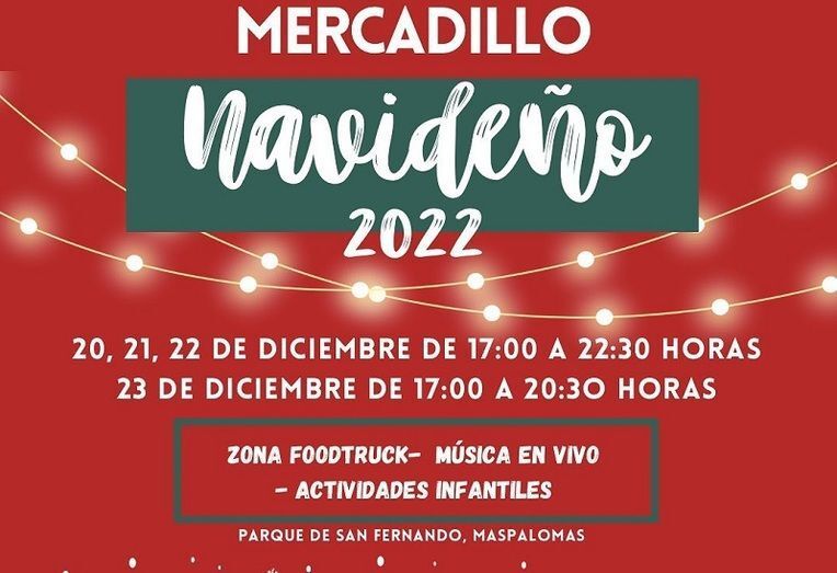 La concejalía de juventud del Ayuntamiento de San Bartolomé de Tirajana que dirige Irasema Hernández, ha organizado para estos 3 dias, 20, 21, 22 y 23 de diciembre en el Parque de San Fernando de Maspalomas, un "Mercadillo Navideño" dónde poder pasar la tarde en familia, con actividade para los más pequeño, música en vivo y zona Foodtruck.