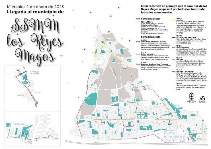 El recorrido comenzará alrededor de las 10 horas en Santa Lucía casco, en donde partirán desde El Paradero y realizarán un recorrido circular a través de las vías Tomás Arroyo Cardoso, Leopoldo Matos, Senador Castillo Olivares, Pérez del Toro, Maestro Enrique Hernández González y finalizarán en el mismo punto de partida. A las 11 horas llegarán a la zona costera iniciando su recorrido desde la trasera del teatro Víctor Jara y pasando por Vecindario, el Canario, Balos, Los Llanos, Cruce de Sardina, Casa Pastores, La Blanca, Sardina, La Orilla, Doctoral casco, Pozo Izquierdo, Doctoral y Vecindario (Ver el mapa adjunto para comprobar el tramo de las calles y el horario aproximado por las que pasará la comitiva real).