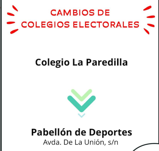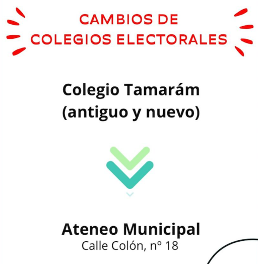 Las personas que votaron en el CEIP La Paredilla, deberán acerlo en el Pabellón de Deportes, en la Avenida de La Unión, s/n. Quienes votaban en el CEIP Tamarán (tanto el antiguo como el nuevo) este domingo deberán acudir al Ateneo Municipal, en la calle Colón número 18.