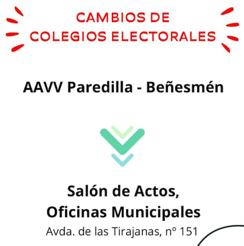 Quienes votaron en los últimos comicios en el Colegio Electoral de la Asociación Vecinal Beñesmen-Paredilla, el próximo domingo deberán acudir a ejercer su derecho al voto al salón de actos de las oficinas municipales de Vecindario, en la Avenida de las Tirajanas, 151, frente a la Karpa.