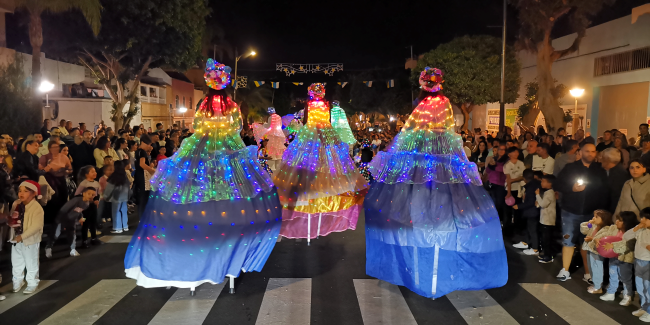 Un carnaval de luz recorrió la avenida de Ansite este sábado en el Cruce de Arinaga. Elfos, zancudos, muñecotes, malabaristas y otros personajes, portaron a ritmo de batucada todo tipo de artefactos para llevar la luz de la Navidad a los principales rincones del municipio. Tras una emocionante cuenta atrás y ante la expectante mirada de cientos de vecinos y visitantes, el alcalde de Agüimes, Óscar Hernández, pulsó el botón que encendía los cerca de 400 elementos decorativos y más de 700.000 leds que engalanan las calles y principales plazas de la villa con motivo del período navideño.