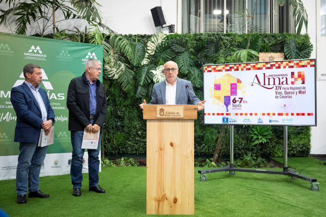 El Patio de Casa Palacio acogió este jueves la presentación de la XIV Feria Regional de Vino, Queso y Miel de Canarias – Alma de Medianías, un evento ya consolidado en el calendario insular que este año se celebrará en Tejeda, los días 6 y 7 de diciembre. La feria, impulsada por la Mancomunidad de Municipios de Medianías de Gran Canaria y financiada por el Cabildo a través de la Consejería de Desarrollo Económico, reunirá 42 puestos de productores y cerca de 50 marcas procedentes de seis islas del archipiélago.