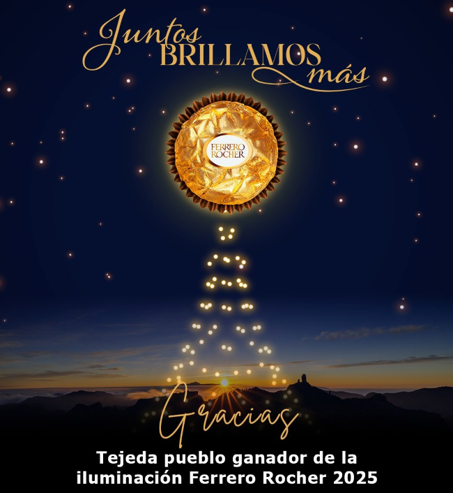 Tejeda celebra con orgullo y emoción su proclamación como pueblo ganador del concurso nacional “Juntos Brillamos Más” de Ferrero Rocher 2025, un reconocimiento que permitirá al municipio llevar la luz y el espíritu de la Navidad a todos los rincones de España.
