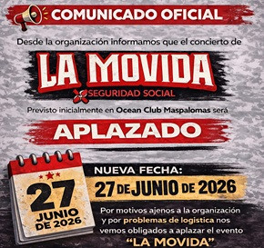 Desde la organización informamos que el concierto de LA MOVIDA – Previsto inicialmente en Ocean Club Maspalomas será aplazado por motivos de logística.