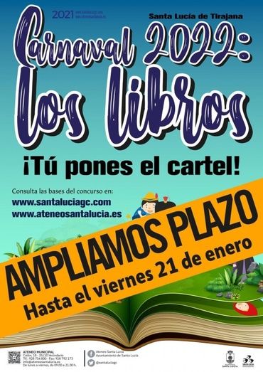 El plazo para presentar los trabajos para el concurso del cartel anunciador del Carnaval 2022 de Santa Lucía de Tirajana dedicado a los libros se amplía hasta el próximo 21 de enero. El cartel servirá para anunciar y promocionar las populares fiestas en el municipio del sureste de Gran Canaria, el premio al autor o autora del cartel ganador será de 1.000 euros.