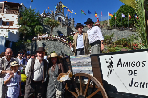 Desde las 10 de la mañana las carretas y carrozas empiezan a colocarse en los puestos de salida, en un lado del pueblo. Poco a poco van llegando las parrandas. Apenas termina la misa canaria en la iglesia, empiezan a sonar los primeros timples y guitarras de las parrandas. No falta el acordeón y el pandero. En una parranda junto a El Mirador la cantante y actriz Tania Gil canta: “Señores no me lo creo, señores ay qué alegría, que después de estos dos años, estamos de romería”. El verseador satauteño José María Dávila, aparece con el timple al hombro y también se incorpora a una parranda como uno más.